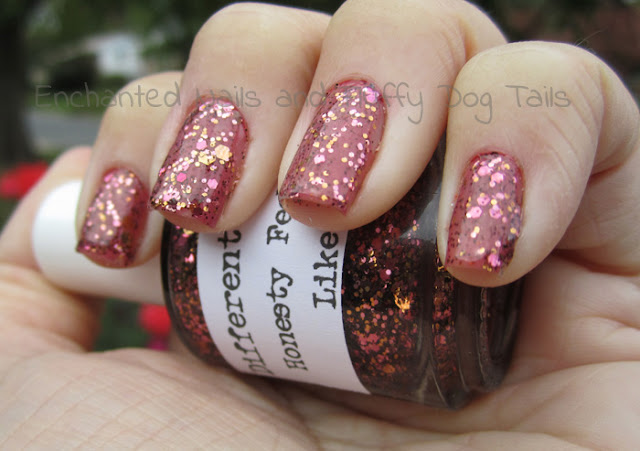 The fourth is Honesty Feels A Lot Like Mean. I showcased this earlier this week for Go Pink Wednesday, but it's too beautiful to not include a few shots of it here as well. It's a clear base packed full of different sized pink and brown glitters. Totally stunning. Here I have it over 1 coat of Essie All Tied Up. Just gorgeous the way it sparkles!